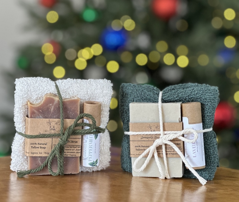 In this Holiday Soap Gift Set you get a wash rag, a bar of tallow soap, and tallow ChapStick!